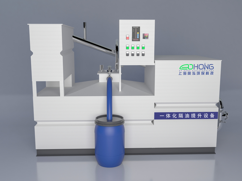 设备总入水口连接污油水总汇管,自流分俩路进入隔油提升设备内,污水中的杂物被分离在固液分离装置中,而污水和油脂进入箱体内,水位上升到一定位置,通过油水的密度差收集到污油收集区再经过液压自流进入储油箱,储油箱满后可自动回流到油水分离区,再引用虹吸原理,排出的只是污水,不会吸走水面剩余油脂,当再次水面到达一定位置时,可使油水充分分离,隔油精度高,可节省再建隔油池。